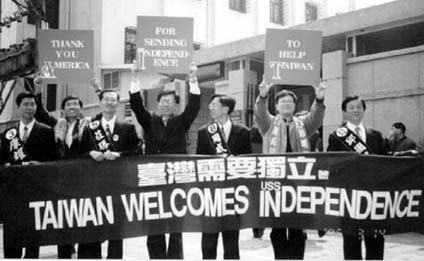 One of the aircraft carriers was appropriately named USS Independence, which prompted DPP Legislator Shen Fu-hsiung and a number of prominent members of the Democratic Progressive Party in Taipei to stage a friendly demonstration in front of the American Institute in Taiwan (the informal American embassy) with a big banner, saying "Taiwan Welcomes (uss) Independence."